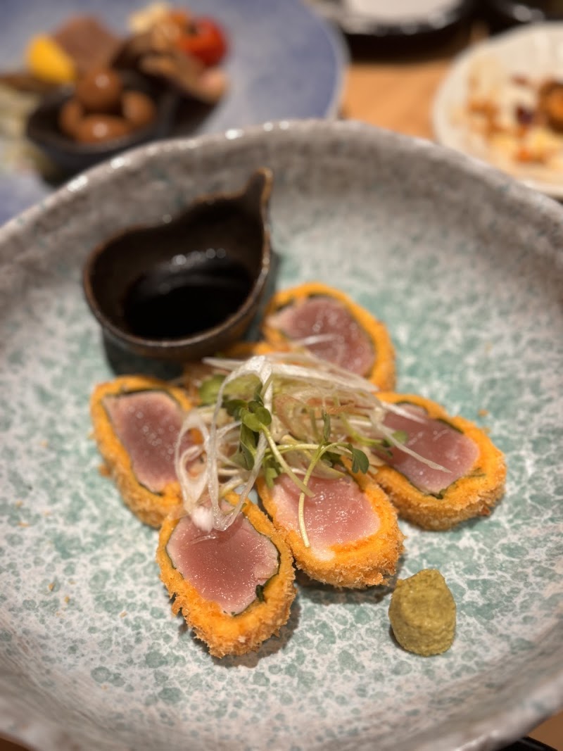 原始焼きに藁焼きに釜飯も🥰そそるメニューが大渋滞❣️炭火の遠赤外線効果で外はパリッと、中はふっくらと旨みが凝縮された立派なサイズの大トロ鰯はぜひ食べてみて🐟❤️海老も特大サイズで、自家製タルタルソースで頂くのが美味しかった✨✨藁焼きは、牛ハラミと知覧鶏とマグロほほ肉と迷って、マグロのほほ肉にしました✨中はレアで藁の香りを纏って弾力があってお肉みたいな食感✨釜飯も迷って、鮭ハラスといくらの親子丼に🥰厚みのある鮭ハラスはふっくらと、いくらたっぷり、お出汁のきいたお米もすごく美味しかった💕あとぜひ頼んでほしいのは、シャトーブリタン串‼️贅沢にタンの柔らかい部分のみを使用されていてプリっと食感がたまらなく美味しい✨厚みがまたすごいんです😆◯頂いたメニュー大トロ鰯¥858特大海老自家製タルタル添え¥1,485マグロほほ肉のタタキ藁炙り¥1,056鮭ハラスといくらの親子釜飯¥1,958鴨ロースと葉わさびのツンツンサラダ¥1,023帆立バター醤油¥583 ×2和牛炙りカルパッチョ¥825シャトーブリタン串¥715 ×2炎をあげながら焼き上げる藁焼きや、原始焼きのライブ感を感じられるカウンター席は雰囲気も楽しめます✨今回利用したテーブル席は広々とした寛ぎ空間✨ぜひ行ってみてくださいね☺️