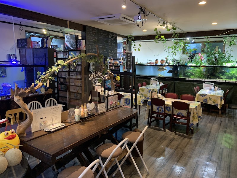 大きな水槽の熱帯魚が印象的で、店内の雰囲気が独特です。