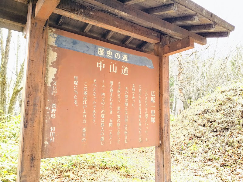 片側のみ現存している一里塚。1750年頃の岐蘇路安見絵図では街道の両側に描かれている一里塚だが、その約50年後の中山道分間延絵図では街道の外側に取り残されて描かれている。先の「唐沢の一里塚」近辺の中山道筋と同様に、この辺りの中山道も改修されたと思われる。この一里塚を通過するということは、現在案内されている中山道は改修以前の旧中山道である。