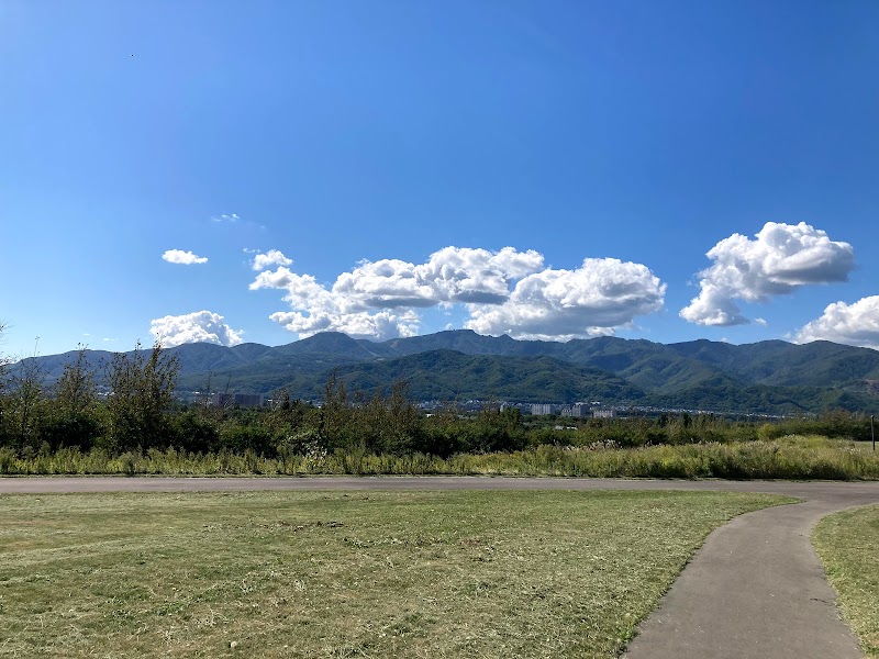 手稲山を望む整備された芝生で、散歩やランニングにぴったりです。