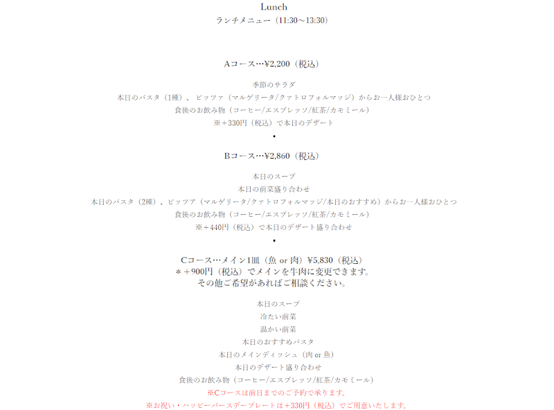 ランチは前日予約しないと入らないみたいです。予約を取れて、ランチを食べられて、良かったです!チーズのピザはめっちゃくちゃ美味しかった〜