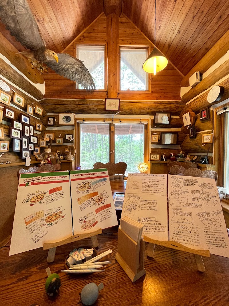 森の中にある別荘地の道を進んで行くと‥コーヒーカップの形をしたお洒落な看板が出迎えてくれます。マザーグースはゴールデンウィークと夏季限定でしかOpenしていないので、何故かオーナーファミリーに「お帰りなさい。待ってましたよ!」と声を掛けてしまいそうになる。店内は天井高く可愛いドールハウスや手作りのオルゴールが素敵にレイアウトされている。今回はお目当てのピザと珈琲のランチプレート(1,000円)を頂きました。外はサクサク中はモッチリとしたミニピザと、ブラジルのブルボン種アマレロの珈琲セットです。香りが深くコクのある独特な珈琲でした。美味しかったぁ!食後のデザートに店主おススメのアフォガードを‥。バニラアイスにエスプレッソを注いで頂くアフォガードは、バニラの甘い香りとエスプレッソの苦味が幾通りもの味を引き出してくれます。アフォガードは「溺れる」という意味があるそうで、まさにその美味しさに溺れてしまいそうでした。ランチは勿論のこと、ドライブ帰りに気軽に寄ってスイーツを頂くのもお勧めです。