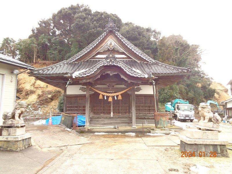 和倉温泉より南の方の住宅街にある神社。御祭神は息長足姫尊 譽田別尊 比咩大神 事代主命。