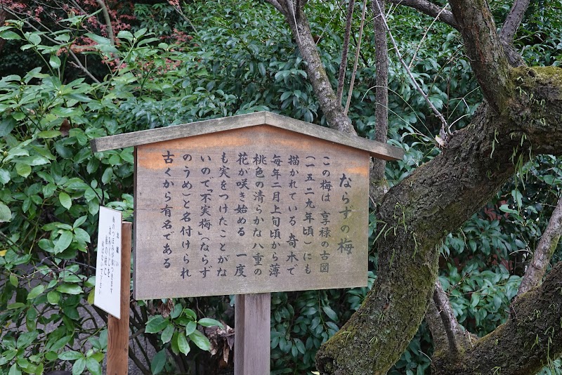 2021.03.01不実の梅高さ約3m樹齢400年以上享禄の古図(1529年頃)にも描かれている奇木で薄桃色の八重の花が咲きいまだかって1度も実を実らせたことがないことで「ならずの梅」と呼ばれています。
