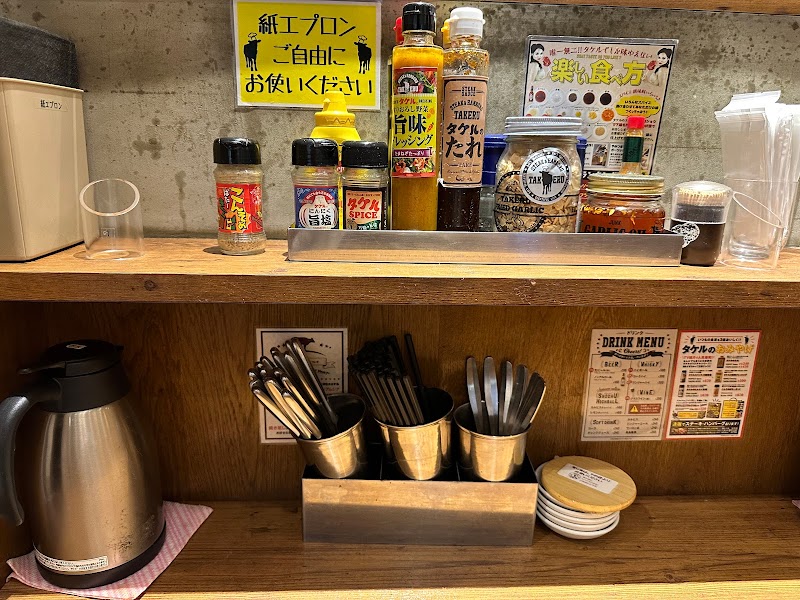 キャンペーン中のTAKERUステーキを注文。こういう安い肉は硬かったり臭かったりするが、問題なく美味しい。追い肉で注文したハンバーグがまた絶品。しっかり肉々しい。ソースのバリエーションも豊富でまた行きたい。