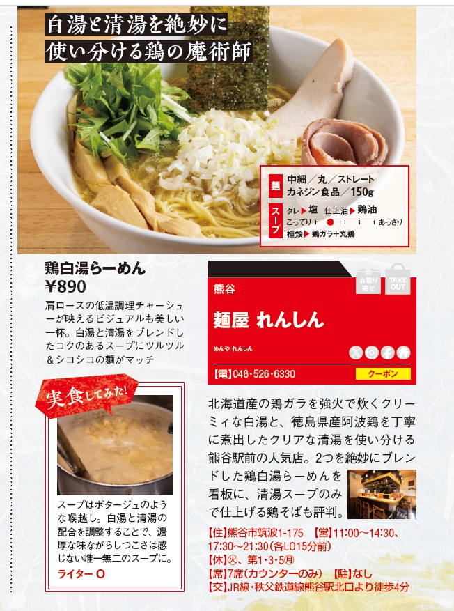 ■鶏ラーメンと言えば!行列もできる丁寧なラーメン店・来店日: 2022/08/26・ 12 時にランチで来店。・JR熊谷駅から徒歩2分。■ひとりでふらっと、あるいはツレと来たいお店・カウンター 7席・中はかなり狭く、ライトアップで、雰囲気のあるお店です。・かなり混みます。時間に余裕をもっての来店を。・注意!待つ際は外で待機になります。熱中症にご注意を。■注文したメニュー:・こってり鶏白湯らーめん 850円 しょうゆ■チャーシュー、メンマの丁寧で上品なこってり鶏そば・鶏チャーシューは柔らかく、しっかり火が通ってます。この味わいは、希少。・スープはやや少なめですが、飲み干せるほど濃厚。丁寧に味わいます。■飲料水はセルフです・ウォーターサーバーが置いてあります。■ただひたすら、ラーメンを食す場所。・BGMがかすかに流れてます。・そこは、黙々と食べるためのカウンター。孤独な戦いが始まる。・うちわが用意されています。・店内は禁煙です。■お支払い・食券制。支払いは現金のみ。