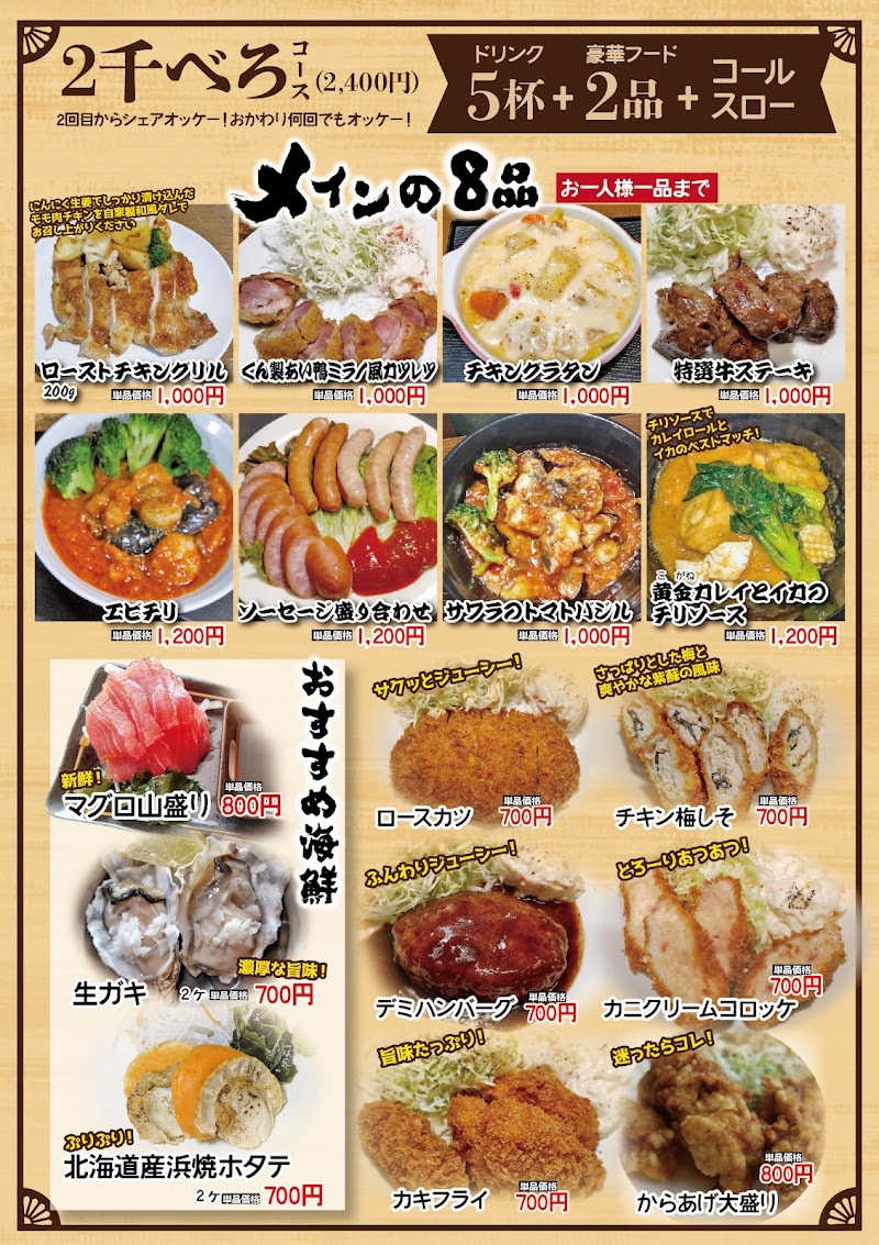 のうれんプラザ内のお店で、昼飲みもできます。センベロはドリンク3杯+一品。選べるメニューの種類が豊富です。オススメは刺身で、量多めです。ビールはジョッキではなくグラスでした。二千ベロもあり、お肉やソーセージの盛り合わせなども選べてドリンク6杯+2品+コールスローがつきます。数人で行ったら食べられないくらいの量になります。