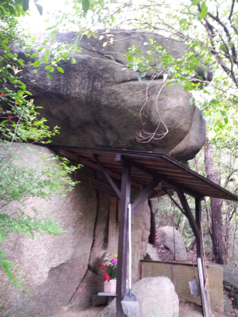 住宅街からかなり逸れたところにあります。小さな木の橋を渡った先にわずかに草が踏みしめられた痕跡があったので、たぶんここだろうと空き地の草むらに突っ込むと階段があります。本当にこんなところに…?と恐々、山を登っていくと猪よけの柵の向こうに階段が。柵をあけて道を登っていくと…ありました!すごい!大岩の下がお堂になっています!こちらもしっかりお世話されているようです!