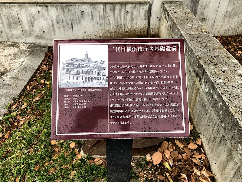 関内駅から横浜スタジアム方向に進むと「二代目横浜市庁舎基礎遺構」があります。この遺構は2013年(平成25年)12月、市庁舎緑化工事に伴って発見された遺構の一部です。二代目横浜市庁舎は、本町1丁目にあった初代市庁舎が手狭になったことを受けて、1911年(明治44年)6月25日竣工されました。外観は煉瓦造りのルネサンス洋式で、全体を白い自然石(白丁場石)の帯でまいている華麗な建物でしたが、1923年(大正12年)の関東大震災で被災し焼失しました。そして現在の横浜市庁舎が建てられました。