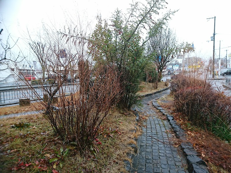 昭和町北交差点の西角、横断歩道橋の階段を降りてすぐのところにある。昔の衣装を着た、子供の立像がある植樹帯。細い遊歩道も設置されてます。案内板もなく、詳細は不明です。