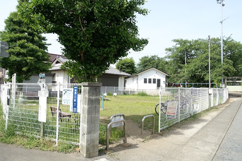 住宅街の端にある神社の参道入口にある遊園。教室ぐらいの広さで土と低い草が生えている。入口は車輌防止柵がありまわりはフェンスで囲まれている。レンタル自転車があり、ブランコ、滑り台、鉄棒、動物の椅子型遊具が2つ、ベンチ2つ、かばの手洗い場、銀杏の木が2つある。