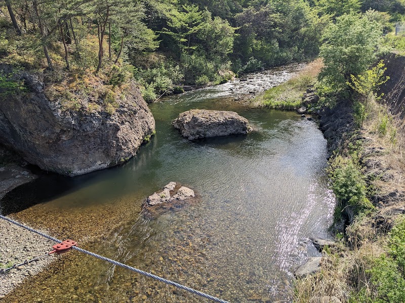 小さく目立たない場所にあるが赤い吊り橋逢瀬橋傾城森へいくのに使います意外に眺めは惡くないかなちょっと見たりするにはいいかと。
