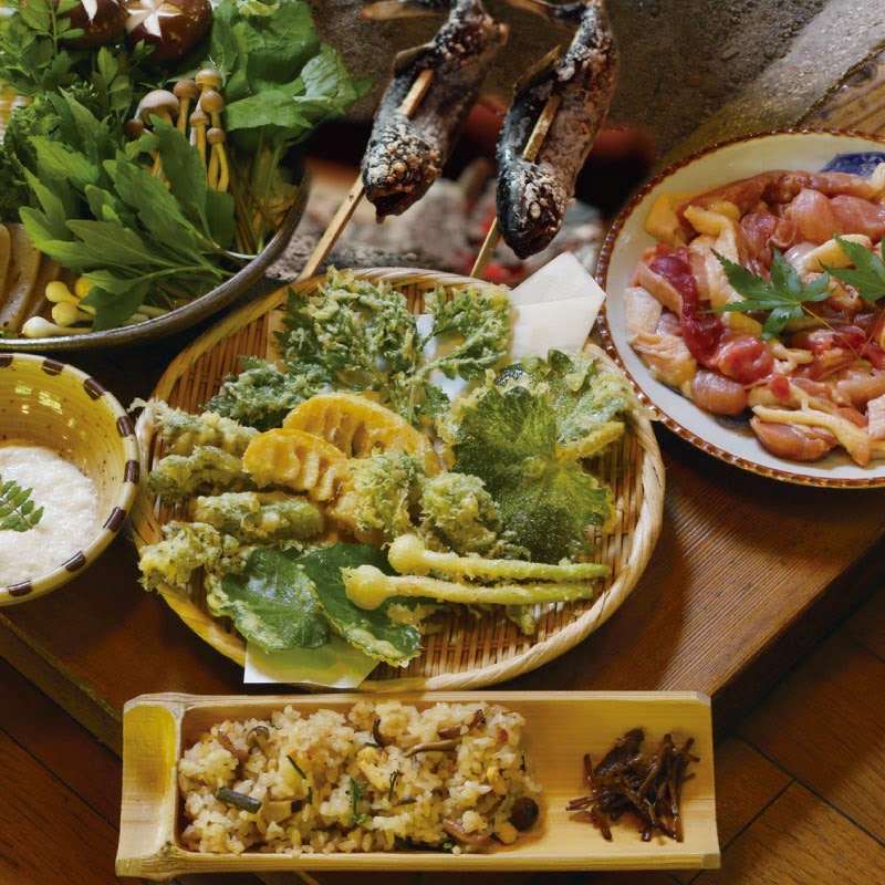 雪景色の中で味わう囲炉裏料理や鶏すき焼き、炭火で焼くアマゴ塩焼きもおすすめです。